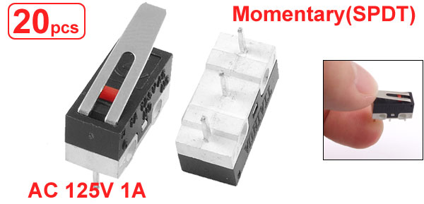 Product Name Micro Switch Voltage & Current AC 125V 1A Poles SPDT Contact Type 1NO + 1NC Action Type Momentary Actuator Type Lever Arm Terminal Type 3-Pin Terminals Overall Size 12.5 x 5.5 x 10mm / 0.49" x 0.22" x 0.39" (L*W*H) Mounting Hole Dia. 2mm / 0.08" Mounting Hole Spacing 6.5mm / 0.26" Pin Pitch 5mm / 0.2" Lever Arm Size 13 x 4mm / 0.51" x 0.16" (L*Max.W) Material Plastic, Metal Color Black, White, Red, Silver Tone Total Weight 14g Package Content 20 x Micro Switches - Reviews