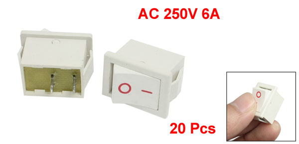 Product Name Rocker Switch Poles SPST Type 2 Pin Terminals (On-Off) Rating Voltage AC 250V 6A Overall Size(Each) 2.1 x 1.5 x 2.1cm / 0.83" x 0.59" x 0.83"(L*W*H) Mounting Size 2 x 1.2cm/ 0.78" x 0.47"(L*W) Main Color White Material Plastic, Electric Parts Weight 54g Package Content 20 Pcs x Rocker Switch - Reviews
