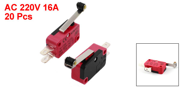 Product Name Micro Switch Model V-156-1C25 Contact Type SPDT(1NO 1NC) Pins 3 Pin Actuator Type Momentary Long Hinge Roller Lever Rating AC 220V 16A Body Size(Each) 28 x 16 x10mm/1.1" x 0.63" x 0.4"(L*W*T) Roller Size 5 x 4mm /0.2" x 0.16" (D*L) Level Length 28mm/1.1" Material Plastic, Metal Switch Color Black, Red Net Weight 142g Package Content 20 Pcs x Micro Switch - Reviews