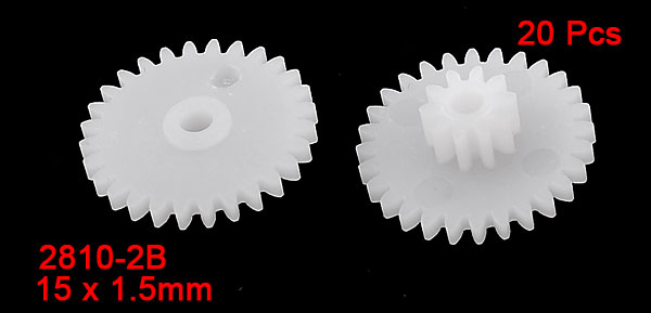 Product Name Plastic Gear Model 2810-2B Total Size 15 x 1.5mm/ 1.14" x 0.06" Material Plastic Color White Net Weight 8g Package Content 20 x Plastic Gear - Reviews