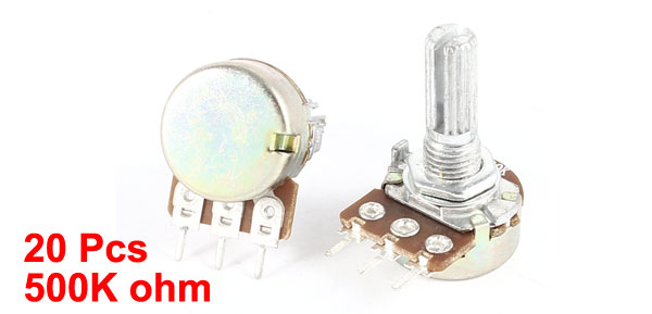 Details20 Pieces B500K 500K Ohm 3-Terminals One Linear Rotary Taper Potentiometers 220V  Product Name Potentiometer Resistance Value 500K ohm Power AC 220V 6A Adjustment Type Top Adjustment Type Single Linear(Type B) Features Knurled Shaft Shaft Diameter 6mm / 0.24" Shaft Length 13mm / 0.55" Mounting Thread Diameter 6.6mm / 0.26" Base Size 16 x 7mm / 0.63" x 0.28"(D*H) Total Height 29mm/1.1" Material Metal, Electronic Parts,Carbon Film Net Weight 140g Package 20 x Potentiometer