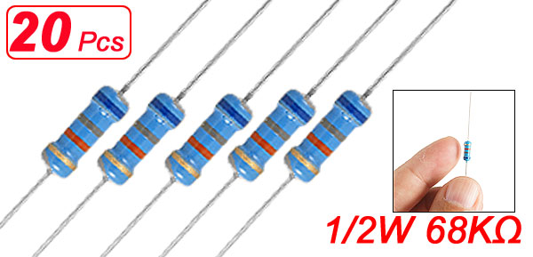 Product Name Carbon Film Resistors Lead Type Axial Rating Power 1/2W Resistance 68K Ohm Resistance Tolerance ± 5% Withstand Voltage 350V Body Size 0.6 x 0.25cm / 0.236" x 0.098"(L*D) Leads Dia 0.03cm / 0.012" Overall Length 5.5cm / 2.2" Color See the Picture Weight 5g Package Content 20 x Carbon Film Resistors - Reviews