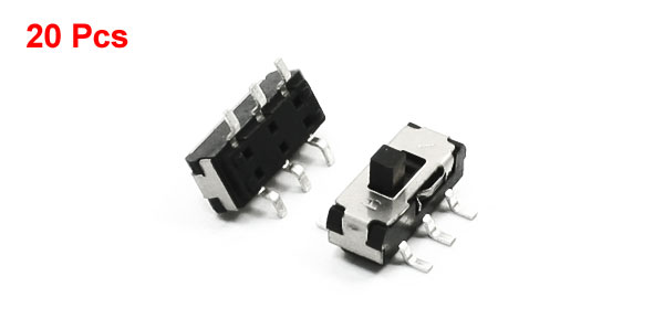 Product Name Slide Switch Position 3 Pins Design 6 Pin(SMD SMT) Contact Type On/Off/On (DPDT) Body Size 9 x 7 x 5.5mm/ 0.35" x 0.28" x 0.22" (L*W*H) Pin Spacing 2mm/0.08" Material Plastic, Metal Color Black, Silver Tone Weight 5g Package 20 x Slide Switch - Reviews