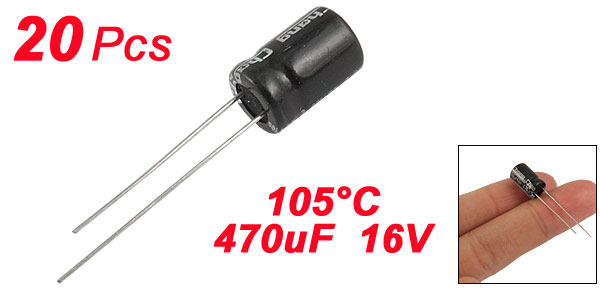 Product Name Aluminum Electrolytic Capacitor Type Radial Lead Maximum Temperature 105°C Voltage 16V Capacitance 470uF Capacitance Tolerance ±20% Body Size 8 x 12mm/0.3'' x 0.47'' (D*L) Lead Spacing 3mm/0.12'' Lead Length 26mm/1'', 21mm/0.83'' External Material Aluminum Weight 20g Color As Picture Shown Package Content 20 Pcs x Electrolytic Capacitors - Reviews