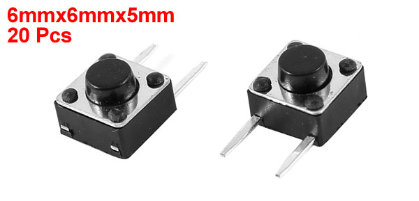 Product Name Tact Switch Action Type Momentary Total Size(Pin Not Include) 6 x 6 x 5mm/0.24" x 0.24" x 0.2"(L*W*T) Button Diameter 3mm/0.1" Material Plastic, Metal Color Black Net Weight 6g Package Content 20 x Tact Switches - Reviews