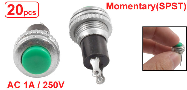 Product Name SPST Push Button Switch Action Type Momentary Contact Type NO Rating Voltage AC 1A / 250V Terminals Quanlity 2 Pins Mounting Hole Diameter 9.5mm / 0.374" Button Diameter 7.7mm / 0.303" Terminals Pitch 4mm / 0.157" Overall Size 13 x 24.5mm / 0.51" x 0.96"(L*W*H) Material Plastic & Metal Color Green, Silver Tone & Black Weight 66g Package Content 20 x SPST Push Button Switch - Reviews