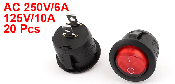 Product Name Rocker Switch Model KCD1-105 Voltage / Current AC 250V/6A 125V/10A Type 2Pin (SPST) Mount type Snap-in Mount Hole 20mm / 0.8" Height 20mm / 0.8" Color Black,Red Weight 92g Package Content 20 x Rocker Switch - Reviews
