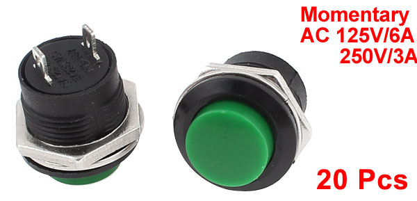 Product Name Push Button Switch Model R13-507 Rating Voltage / Cutrrent AC 125V/6A 250V/3A Type 2Pin SPST Momentary Mount Thread M16x10mm Button Dia 13mm / 0.5" Height 20mm / 0.8" Color Green Weight 126g Package Content 20 x Push Button Switches - Reviews