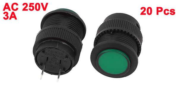 Item Name Push Button Switch Model R16-503A Contact Type NO, SPST Action Type Latching Working Voltage AC 250V Working Current 3A Mounting Thread Diameter 16mm / 0.63" Button Cap Diameter 13mm / 0.5" Terminals 2 Overall Size 18 x 30mm / 0.7" x 1.2" (Dia.*H) Material Plastic, Electronic Parts Color Green, Black Weight 87g Package Content 20 x Push Button Switch - Reviews