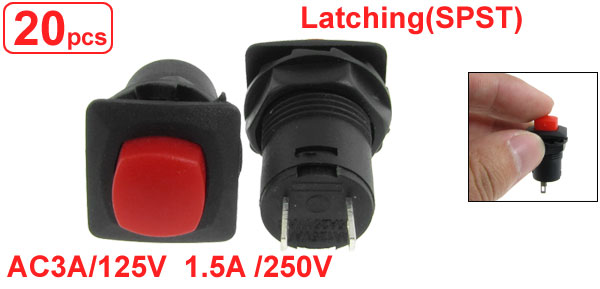 Product Name SPST Push Button Switch Action Type Latching Contact Type NO Rating Voltage AC 3A / 125V; 1.5A / 250V Terminals Quanlity 2 Pins Mounting Hole Diameter 12.3mm / 0.48" Button Size 9 x 9mm / 0.35" x 0.35"(L * W) Terminals Pitch 5.9mm / 0.232" Overall Size 15.4 x 15.4 x 30mm / 0.60" x 0.60" x 1.18"(L*W*H) Material Plastic & Metal Color Red & Black Weight 58g Package Content 20 x SPST Push Button Switch - Reviews
