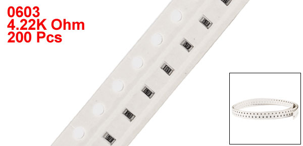 Product Name Chip Resistor Size Code 0603 1608 Size 1.6 x 0.8mm / 0.06" x 0.03"(L*W) Lead Style Surface Mount (SMD - SMT) Resistance Value 4.22K Ohm Power 1/10 W Tolerance ±1% Main Color White Net Weight 5g Package Content 200(±2%) Pcs x Chip Resistors - Reviews