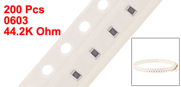 Product Name Chip Resistor Size Code 0603 1608 Size 1.6 x 0.8mm / 0.064" x 0.03"(L*W) Lead Style Surface Mount (SMD - SMT) Resistance Value 44.2K Ohm Power 1/10 W Tolerance ±1% Main Color White Net Weight 5g Package Content 200(±2%) Pcs x Chip Resistors - Reviews