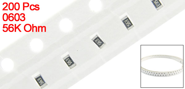 Product Name Chip Resistor Size Code 0603 1608 Size 1.6 x 0.8mm / 0.06" x 0.03"(L*W) Mount Type Surface Mount (SMD - SMT) Resistance Value 56K Ohm Power 1/16 W Tolerance ±5% Main Color White, Black Net Weight 4g Package Content 200(±2%) Pcs x Chip Resistors - Reviews