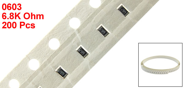 Product Name Chip Resistor Size Code 0603 1608 Size 1.6 x 0.8mm / 0.06" x 0.03"(L*W) Mount Type Surface Mount (SMD - SMT) Resistance Value 6.8K Ohm Power 1/16 W Tolerance ±5% Main Color White, Black Net Weight 4g Package Content 200(±2%) Pcs x Chip Resistors - Reviews