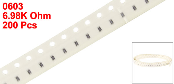 Product Name Chip Resistor Size Code 0603 1608 Size 1.6 x 0.8mm / 0.06" x 0.03"(L*W) Lead Style Surface Mount (SMD - SMT) Resistance Value 6.98K Ohm Power 1/10 W Tolerance ±1% Main Color White Net Weight 5g Package Content 200(±2%) Pcs x Chip Resistors - Reviews