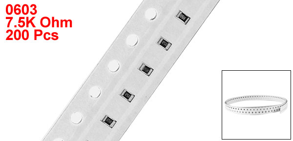 Product Name Chip Resistor Size Code 0603 1608 Size 1.6 x 0.8mm / 0.064" x 0.03"(L*W) Lead Style Surface Mount (SMD - SMT) Resistance Value 7.5K Ohm Power 1/10 W Tolerance ±1% Main Color White Net Weight 5g Package Content 200(±2%) Pcs x Chip Resistors - Reviews
