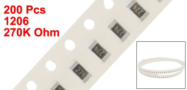 Product Name Chip Resistor Mount Type Surface Mount (SMD - SMT) Type 1206 Resistance Value 270K Ohm Power 1/4W Working Voltage 220V Tempareture -55~+155C Tolerance ±5% Net Weight 6g Package Content 200(±2%) Pcs x Chip Resistors - Reviews