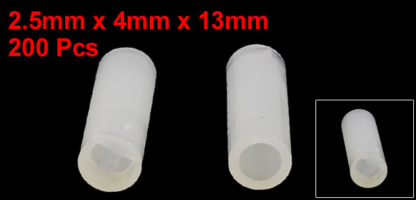 Product Name Spacer Support Inner Dia 2.5mm/0.098" Outer Dia 4mm/0.157" Total Height 13mm/0.51" Main Color White Materials Nylon Net Weight 23g Package Content 200(±2%) x Spacer Support - Reviews