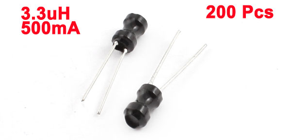 Product Name Radial Lead Inductor Inductance 3.3uH Rating Current 500mA Tolerance 10% Body Size 4 x 6mm / 0.16" x 0.24"(D*H) Pin Size 0.5 x 14mm/ 0.2" x 0.55"(D*L) Lead Distance 2mm / 0.08" Color Black, Silver Tone Weight 58g Package Content 200(±2%) x Radial Lead Inductor - Reviews