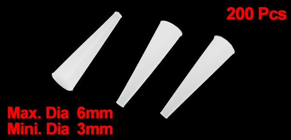 Product Name Tapered Stopper Plug Max. Dia 6mm/ 0.24" Mini. Dia 3mm/ 0.12" Total Length 23mm/ 0.9" Material Silicone Color White Weight 80g Package Content