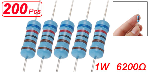 Product Name Metal Film Resistor Quantity 200±2% Pcs Rated Power 1W Tolerance ± 1% Resistance Value 6200 Ω T.C.R(Temperature Coefficient) ±50ppm/°C Body Size 4 x 11mm/ 0.16" x 0.43" (D*L) Leads Dia (Approx.) 0.5mm/ 0.02" Total Length (Approx.) 60mm/ 2.4" Color As Picture Shown Net Weight 116g Package Content 200 Pcs x Metal Film Resistors - Reviews