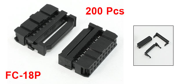 Details200 Pcs FC-18P 2.2mm 18 Pin Male IDC Socket Plug Ribbon Cable Connector Black  Product Name IDC Socket Connector Type FC-18P Pin/Position Number 18 Row Number 2 Total Size 28 x 12 x 5mm / 1" x 0.47" x 0.2" (L*W*H) Pitch 2.2mm / 0.087" Color Black Material Plastic, Metal Weight 634g Package 200(+/-2%) x IDC Socket Connector