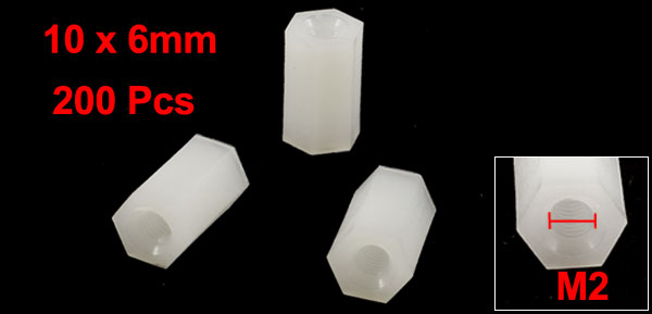 Product Name Threaded Spacer Thread Size M2 Total Size 10 x 6mm / 0.39" x 0.24" (H*D) Material Nylon Color White Net Weight 45g Package Content 200 Pcs (±2%) x Hexagonal Threaded Spacer - Reviews