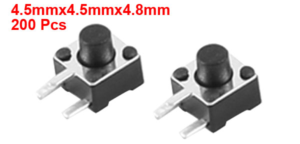 Product Name Tact Switch Type SPST Action Type Momentary Dimension 4.5 x 4.5 x 4.8mm / 0.18" x 0.18" x 0.19"(L*W*H) Button Dia 2mm / 0.08" Pin Length 1.5mm/0.06" Pin Spacing 3 x 2.5mm/0.12" x 0.1"(L*W) Material Plastic, Metal, Electric Parts Color Black, Silver Tone Net Weight 26g Package Content 200(±2%) x Tact Switch - Reviews