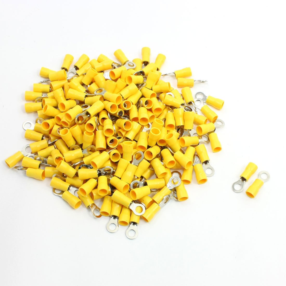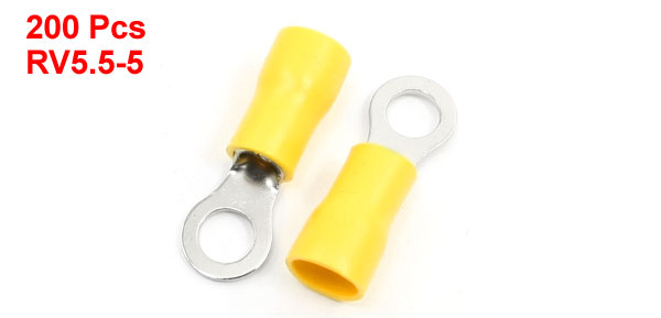 Product Name Pre Insulated Ring Terminal Model RV5.5-5 Design Ring Tongue Type Material PVC, Metal Color Silver Tone, Yellow Fit Cable Size 4-6mm² (A.W.G 12-10) Ring Inner Dia 5.3mm / 0.205" Fit American Bolt #10 Ring Outer Dia 9.5mm / 0.374" Tube Inner Diameter 6.7mm / 0.26" Total Length 25.5mm / 1" Max. Current 48A Weight 193g Package Content 200(±2%) x Pre Insulated Ring Terminal - Reviews
