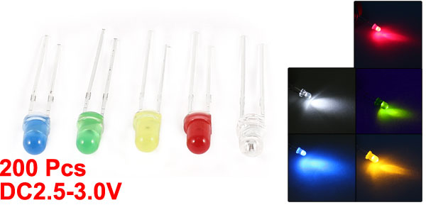 200 Pcs Straw Hat 3mm Red Green Yellow White Blue LED Bulb Light Emitting Diodes