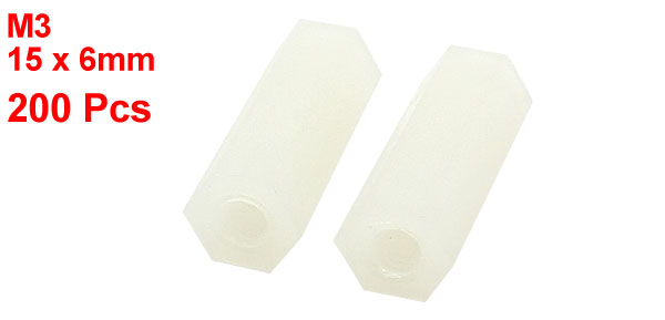 Product Name Hexagonal Threaded Spacer Thread Size M3 Total Size 15 x 6mm / 0.6" x 0.24" (H*D) Material Nylon Color White Net Weight 70g Package Content 200Pcs(± 2%) x Hexagonal Threaded Spacer - Reviews