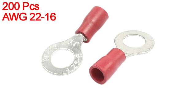 200 Pieces RV1.25-6 Red Sleeve Pre Insulation Ring Terminals for AWG 22-16 Wire