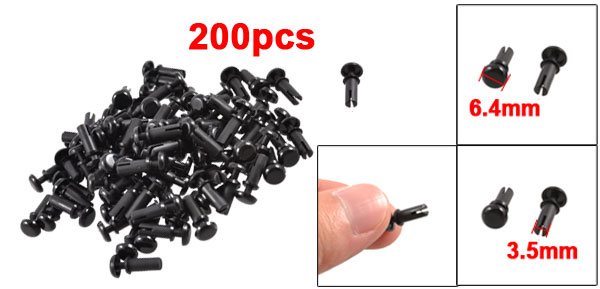 Product Name Push Rivet Part No. R3588 Head Dia.(Approx.) 6.4mm/ 0.25" Head Thickness(Approx.) 1.6mm/ 0.063" Bottom Dia.(Approx.) 3.5mm/ 0.137" Push In Height(Approx.) 8.5mm/ 0.33" Total Height(Approx,) 13mm/ 0.51" Fit for Panel Thickness 7.3-8.3mm Material Nylon Color Black Net Weight 28g Package Content 200±2% Pcs x Push Rivet - Reviews