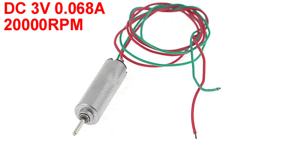 Product Name 412 DC Motor Rated Voltage DC 3V Rated Current 68mA Speed 20000RPM Shaft Diameter 0.6mm / 0.024" Shaft Length 4mm / 0.16" Body Diameter 4mm / 0.16" Total Length 18mm / 0.7" Cable Length 17.5cm/ 6.9“ Main Color Silver Tone Material Metal Weight 1g Package 1 x 412 DC Motor - Reviews