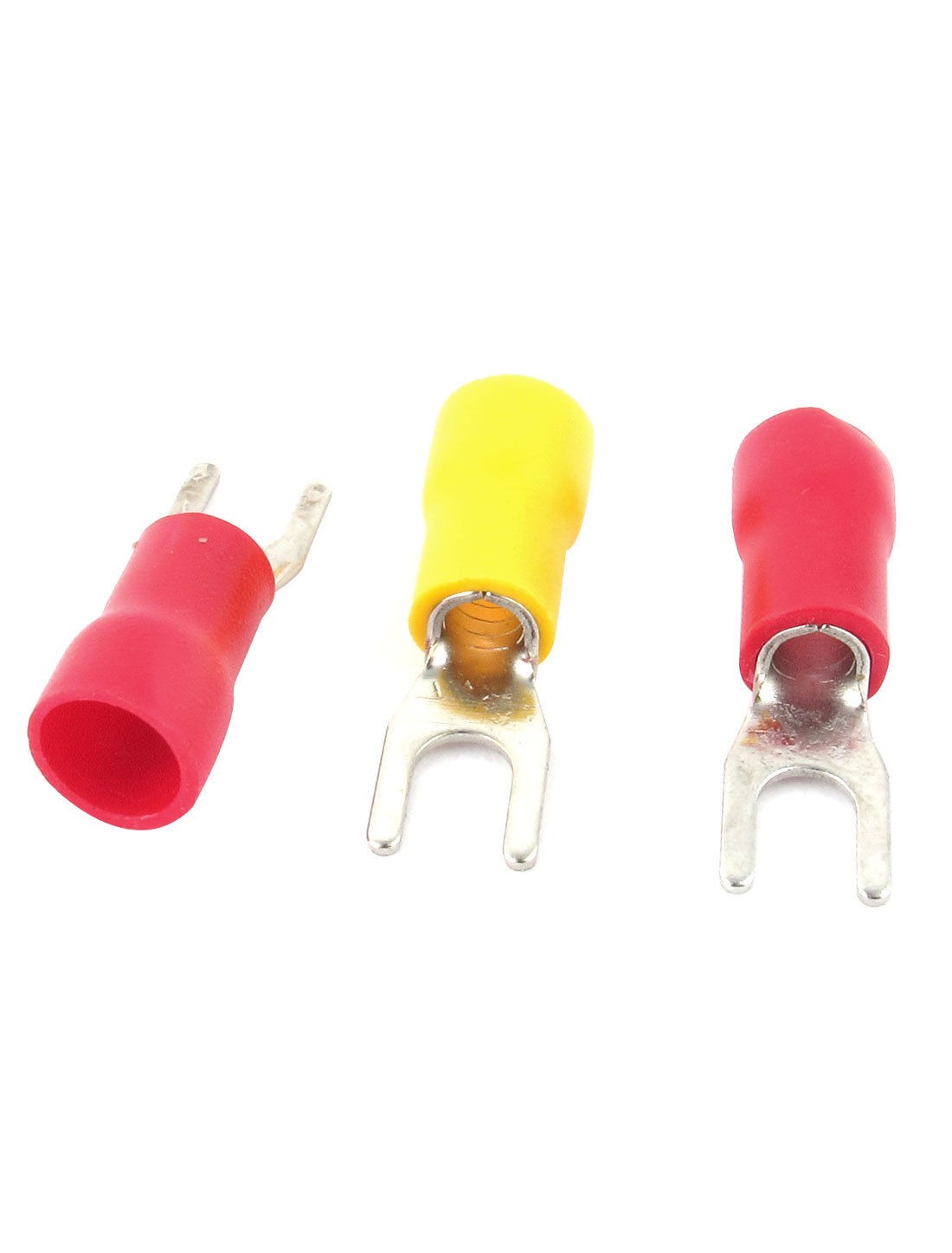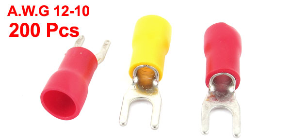 Details200pcs 12-10 AWG Wire Connector Insulated Fork Spade Terminal #8 Red Yellow  Product Name Fork Spade Terminal Model SVS 5.5-4 Design Fork Type Material Plastic, Metal Color Silver Tone, Red, Yellow Fit Cable Size 4 - 6mm2 (A.W.G 12-10) Fit for #8 Bolt Max. Current 48A Weight 204g Package Content 200(+/-2%) x Red+Yellow Fork Spade Terminal