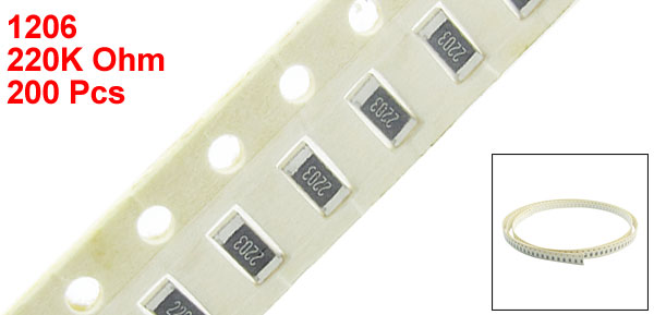 Product Name SMD Chip Resistor Size Code 1206 3216 Size 3.2 x 1.6 x 0.55mm / 0.13" x 0.06" x 0.02"(L*W*T) Lead Style Surface Mount (SMD - SMT) Resistance Value 220K Ohm Tolerance ±1% Power 1/4W Main Color White, Black Weight 6g Package Content 200(±2%) Pcs x SMD Chip Resistor - Reviews