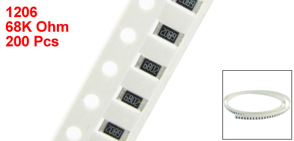 Product Name SMD Chip Resistor Size Code 1206 3216 Size 3.2 x 1.6 x 0.55mm / 0.13" x 0.06" x 0.02"(L*W*T) Lead Style Surface Mount (SMD - SMT) Resistance Value 68K Ohm Tolerance ±1% Power 1/4W Main Color White, Black Weight 6g Package Content 200(±2%) Pcs x SMD Chip Resistor - Reviews
