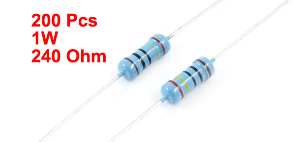 Product Name Metal Film Resistors Power Rating 1W Resistance 240 Ohm Tolerance ±1% Total Length(Approx.) 6cm /2.4" Body Size 4 x 10.5mm/0.16" x 0.41"(D*L) Color As Picture Show Weight 113g Package Content 200(± 2%) x Metal Film Resistors - Reviews