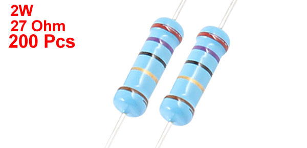 Product Name Metal Film Resistors Power Rating 2W Resistance 27 Ohm Tolerance ±1% Total Length(Approx.) 7cm /2.8" Body Size 4 x 15mm/0.16" x 0.6"(D*L) Color As Picture Show Weight 177g Package Content 200(± 2%) x Metal Film Resistors - Reviews