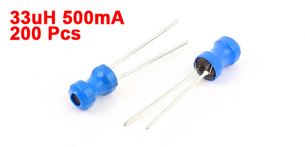Details200Pcs 33uH 500mA 4x6mm 10% Tolerance Radial Lead Inductor Blue  Product Name Radial Lead Inductor Inductance 33uH Rating Current 500mA Tolerance 10% Body Size 4 x 6mm / 0.16" x 0.24"(D*H) Pin Length 19mm/ 0.75" Lead Distance 2mm / 0.08" Color Blue, Silver Tone Weight 80g Package Content 200 x Radial Lead Inductor