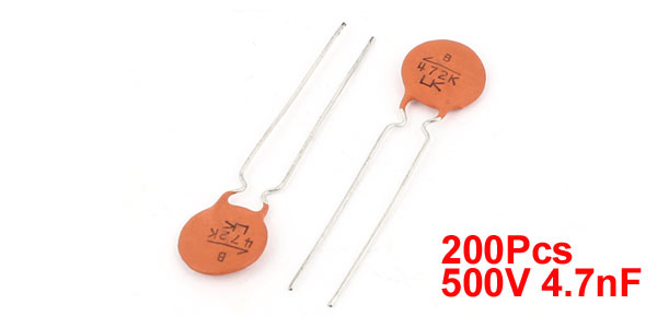 Details200Pcs 500V 4.7nF Yellow High Voltage Ceramic Capacitor 10% Tolerance  Product Name Ceramic Disc Capacitors Voltage Rating 500V Capacitance 4.7nF Capacitance Tolerance ±10% Body Size 10 x 2.5mm/0.39" x 0.10"(D*T) Lead Space 5mm/0.20" Lead Length 29mm/1.1" Main Color Yellow, Silver Tone Weight 113g Package Content 200(±2%) x Ceramic Disc Capacitors
