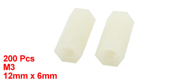 200Pcs 6 x 12mm Insulation Hex Hexagonal Threaded Spacer Support M3 Thread