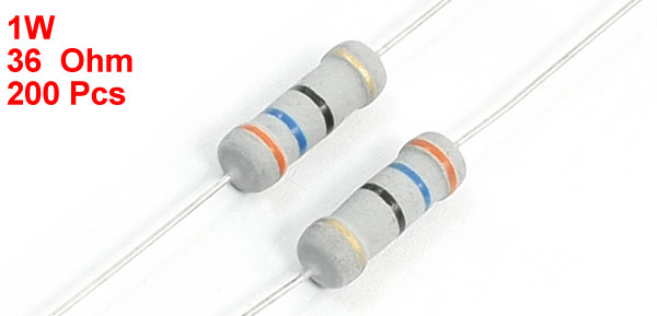 Product Name Metal Oxide Film Resistor Lead Type Axial Leads Power Rating 1W Resistance Tolerance ± 5% Resistance 36 Ohm Voltage 500V Body Size (Approx) 10 x 3mm / 0.4" x 0.12" (L*D) Total Length 5.8cm/2.3" Main Color Gray Weight 60g Package Content 200(±2%)Pcs x Metal Oxide Film Resistors - Reviews