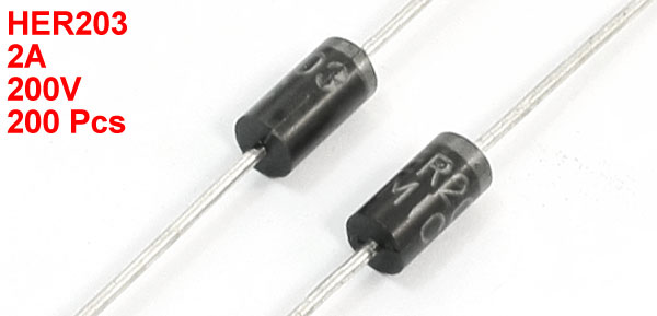 Product Name High Efficiency Rectifier Diode Model HER203 Forward Current 2A Max Peak Reverse Voltage 200V Lead Size 0.7 x 26mm/ 0.01" x 1"(D*L) Body Size 3 x 6.5mm/ 0.12" x 0.25" (D*L) Main Color Black, Silver Tone Weight 64g Package Content 200 Pcs(±2%) x High Efficiency Rectifier Diode - Reviews