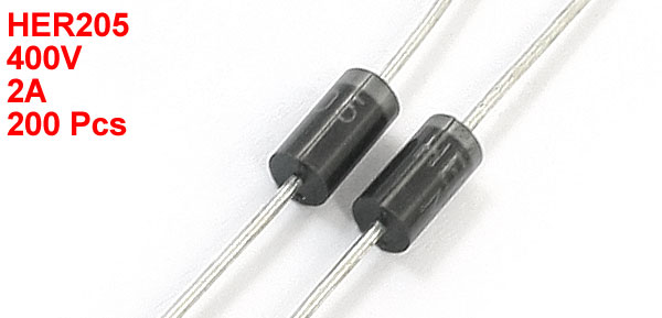Product Name High Efficiency Rectifier Diodes Model HER205 Max Repetitive Peak Reverse Voltage 400V Average Forward Current 2A Lead Size(Each Side) 0.7 x 26mm/0.08" x 1"(D*L) Body Dimension 3 x 6mm/0.12" x 0.24"(D*L) Color As Picture Shown Weight 64g Package Content 200Pcs(±2%) x High Efficiency Rectifier Diodes - Reviews