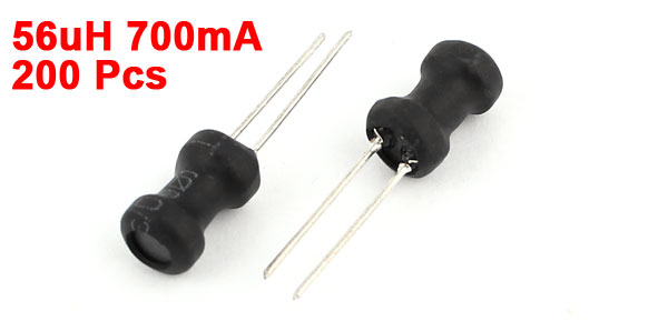 Product Name Inductor Inductance 56uH Rating Current 700mA Tolerance 10% Body Size 6 x 10mm / 0.24" x 0.4"(D*H) Pin Size 0.5 x 15mm/ 0.02" x 0.6"(D*L) Lead Distance 2mm / 0.08" Color Black, Silver Tone Weight 204g Package Content 200Pcs(+/-2%) x Inductors - Reviews