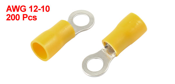 Product Name Pre Insulated Ring Terminal Model RV5.5-5 Design Ring Tongue Type Material PVC, Metal Color Silver Tone, Yellow Fit Cable Size 4-6mm² (A.W.G 12-10) Ring Inner Dia 5.3mm / 0.205" Fit American Bolt #10 Ring Outer Dia 9.5mm / 0.374" Tube Inner Diameter 6.7mm / 0.26" Total Length 25.5mm / 1" Max. Current 48A Weight 181g Package Content 200(±2%) x Pre Insulated Ring Terminal - Reviews