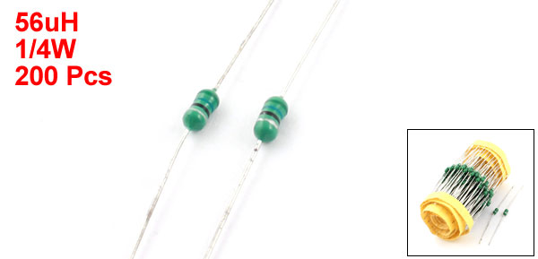 Product Name Color Ring Inductor Inductance Tolerance +/-10%(K) Inductance 56uH Power 1/4W Material Epoxy Resin, Metal, Inductor Body Size 3mm x 7mm / 0.12" x 0.27"(Max.D*L) Lead Diameter 0.4mm / 0.016" Total Length 6cm / 2.4" Net Weight 35g Package Content 200(+/-2%) x Color Ring Inductor - Reviews