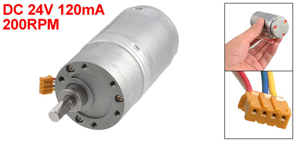 Details200RPM Output Speed DC 24V 120mA Copying Machine Component Geared Motor 37GB  Product Name DC Geared Motor Model Type 37GB Rated Voltage DC 24V Current 120mA Speed 200RPM Shaft Size 6 x 13mm/ 0.24" x 0.51"(D*H) Cable Length 65mm/ 2.6" Body Size 37 x 71mm / 1.4" x 2.8"(Max.D*H) Total Length 93mm / 3.7" Main Color Silver Tone, White, Yellow, Red, Teal Blue Main Material Metal, Plastic Weight 237g Package 1 x DC Geared Motor