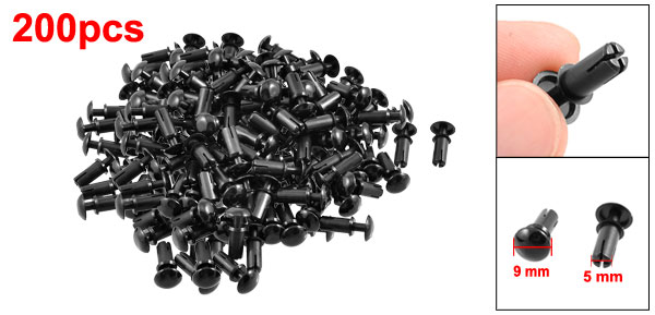 Product Name Push Rivet Part No. R5105 Head Dia.(Approx.) 9.0mm/ 0.35" Head Thickness(Approx.) 2.2mm/ 0.086" Bottom Dia.(Approx.) 5.0mm/ 0.198" Push in Height(Approx.) 10.5mm/ 0.37" Total Height(Approx,) 17mm/ 0.67" Fit for Panel Thickness 7.5-8.5mm Material Nylon Color Black Net Weight 64g Package Content 200±2% Pcs x Push Rivet - Reviews